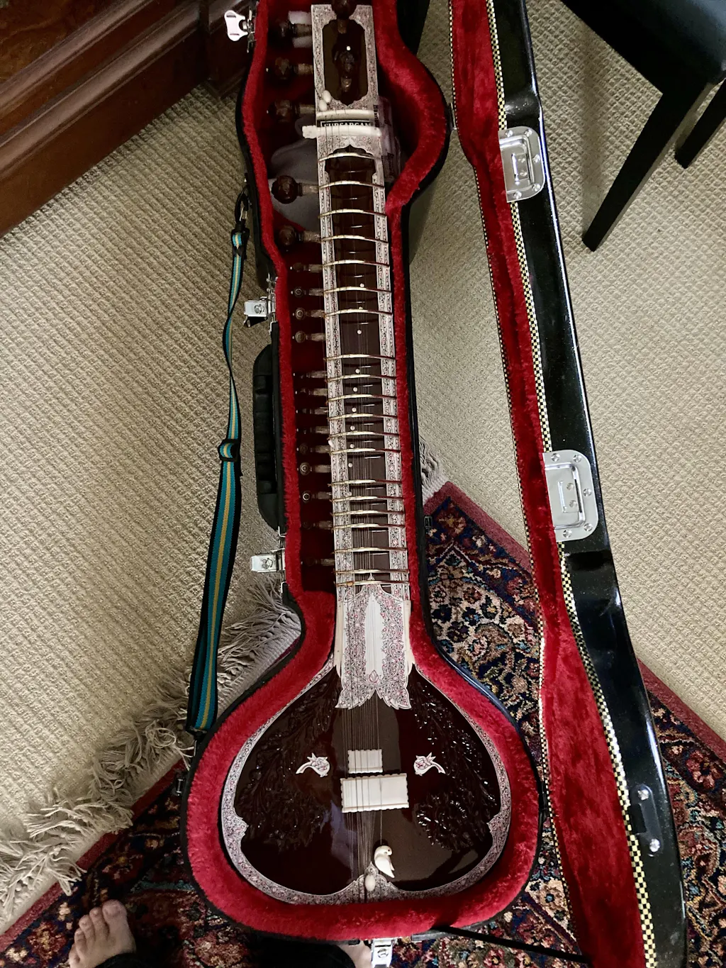 We have these in our inventory in the U.S., and they are each set up in our Urbana, IL shop before shipping. This model has 7 main strings and 13 taraf/sympathetic strings. The finish is a warm mahogany / brown two tone and the carving and penwork are nicely done. The tone and action of this sitar are both very nice. This instrument is well done and a great value. A hard case is included.
