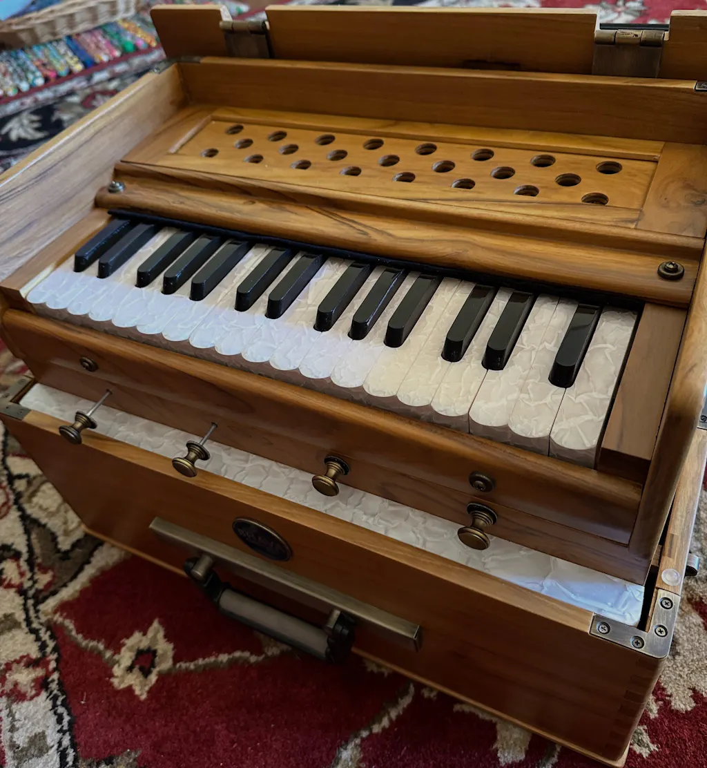 The Bhava Mini harmonium is a collapsing 32-key travel harmonium. Made to sound incredible and last a lifetime, this Concert Teak Edition is a true heirloom-quality build.